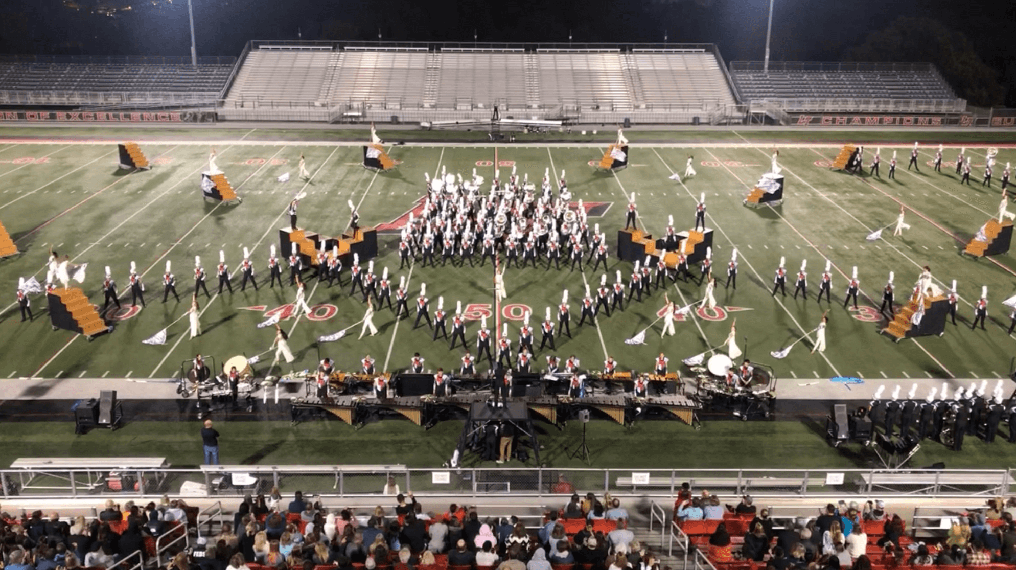 Created for marching show about M. C. Escher's eternal stairs. While Escher's designs are an optical illusion, the goal of this design a real-world way of creating an infinite staircase
